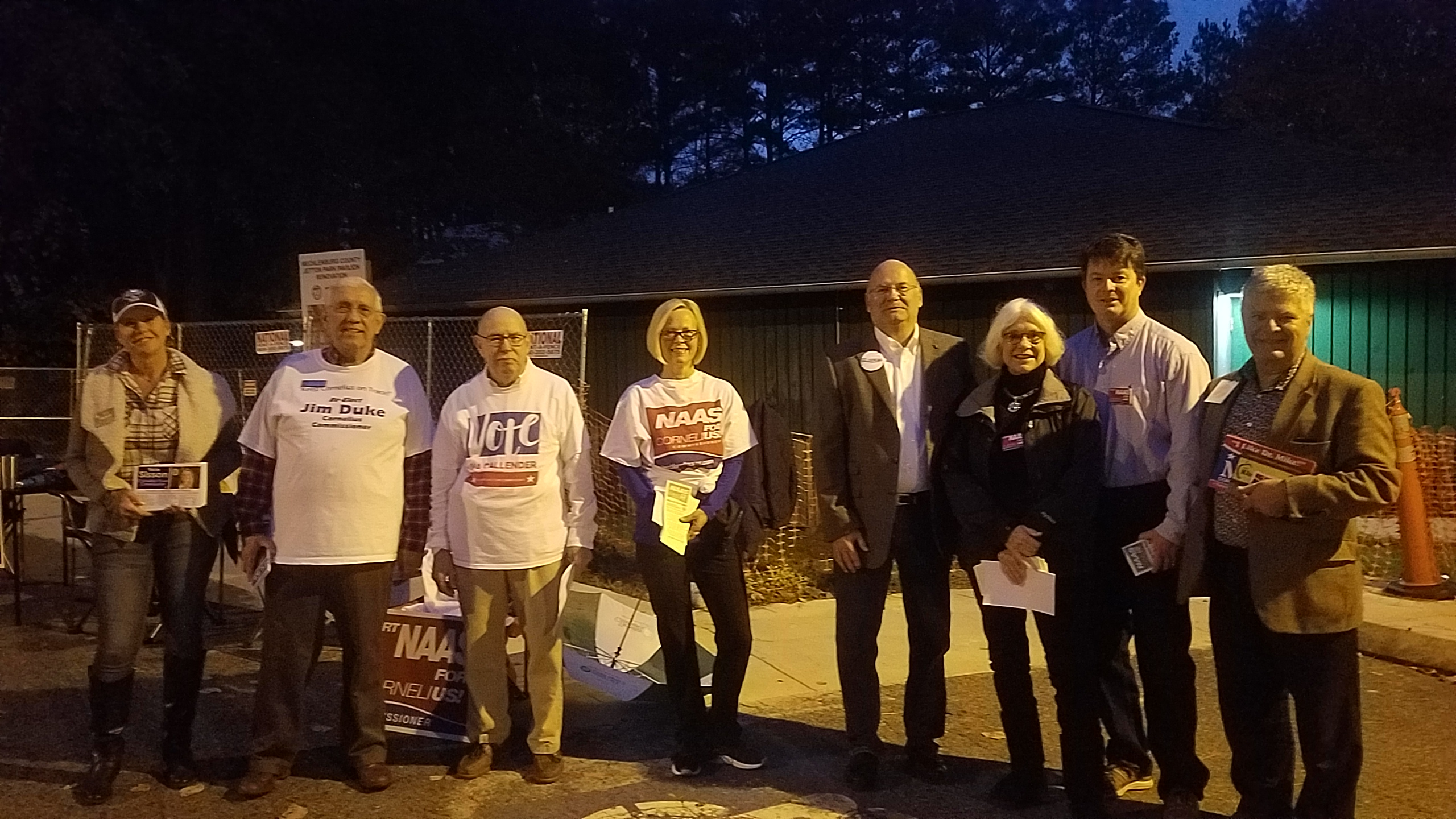 ELECTION DAY 8 AM. It’s a murky day, but many Cornelius voters can expect a bright and shiny greeting when they go to the polls between now and 7:30 pm. Candidates and their supporters were out in force at the Jetton Park and Town Hall precincts, not so much at Bethel Presbyterian Church and Community in Christ Lutheran Church. Turnout so far was sporadic, according to candidates, with early voting, which ended Saturday, netting nearly 3,000 voters at Town Hall.