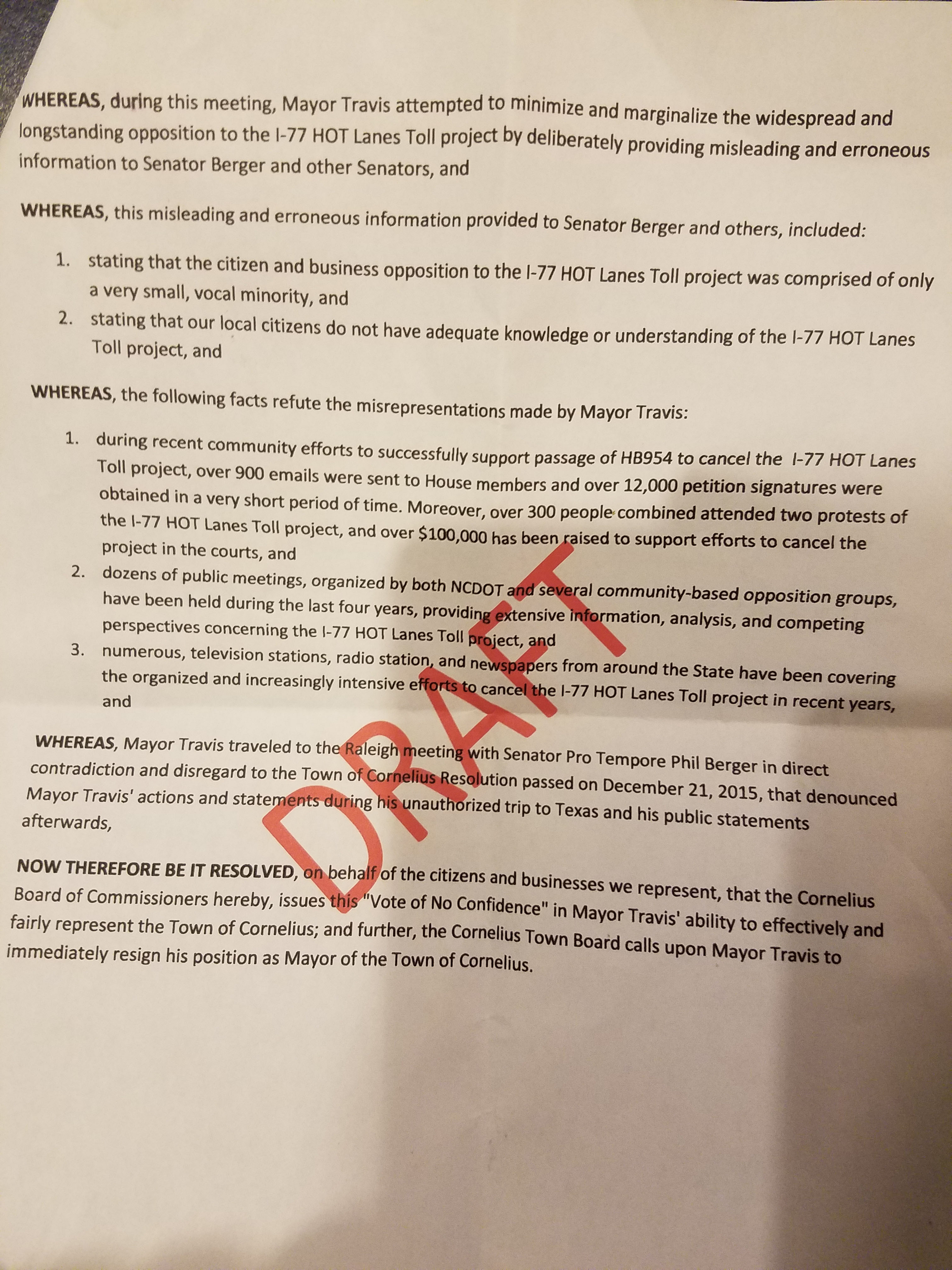 June 13. The Cornelius Town Board has called a special meeting for 6 pm Tuesday to ask Mayor Chuck Travis to immediately resign. A resolution circulated amongst the commissioners Sunday and today declared a lack of confidence in the mayor’s “ability to effectively and fairly represent the Town of Cornelius and further, the Cornelius Town Board calls upon Mayor Travis to immediately resign his position as Mayor of the Town of Cornelius.”