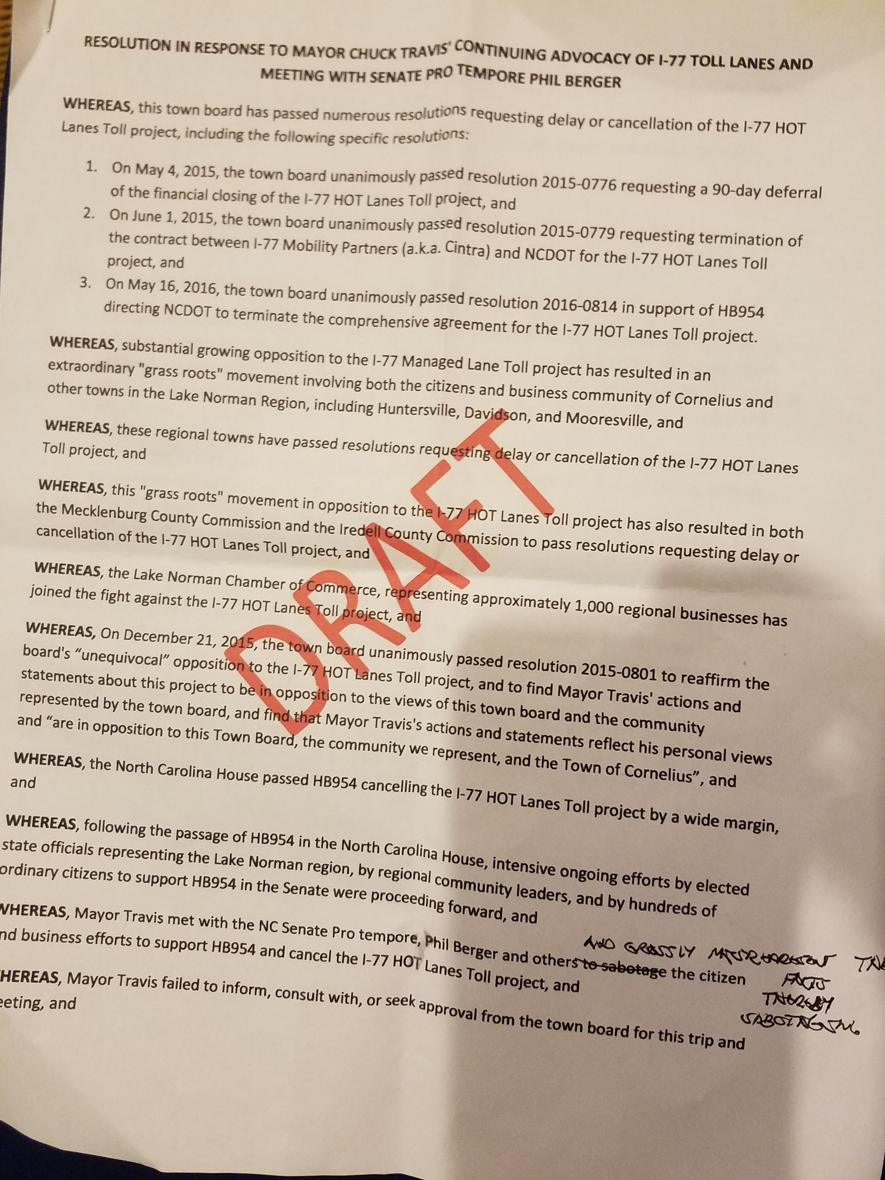 Defying the Cornelius Town Board, Travis met with NC Sen. Philip Berger in Raleigh and argued in favor of the tolls being built between Lake Norman and Charlotte. He was also joined by Davidson Mayor John Woods. A vote of no confidence is also being discussed in the neighboring town.