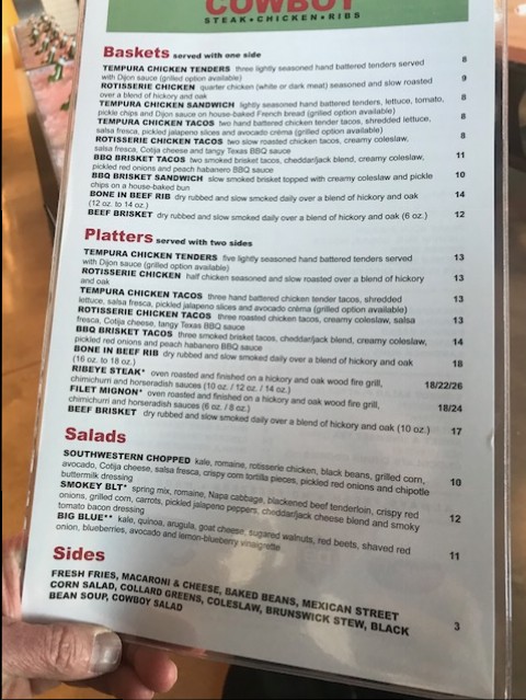 March 26. By Elisabeth Richardson. After making us wait for months, Cowboy Steak Chicken & Ribs officially opens today, offering a full menu featuring Rotisserie Chicken, Beef Brisket, Bone in Beef Rib, Filet Mignon, Smokey BLT Salad, Southwestern Chopped Salad and more. The menu centers on traditional steak and BBQ fare, often with a twist. For instance, the BBQ Brisket Tacos are sure to become a lunch favorite with cheddar/jack blend, creamy coleslaw, pickled red onions, and peach habanero BBQ sauce.