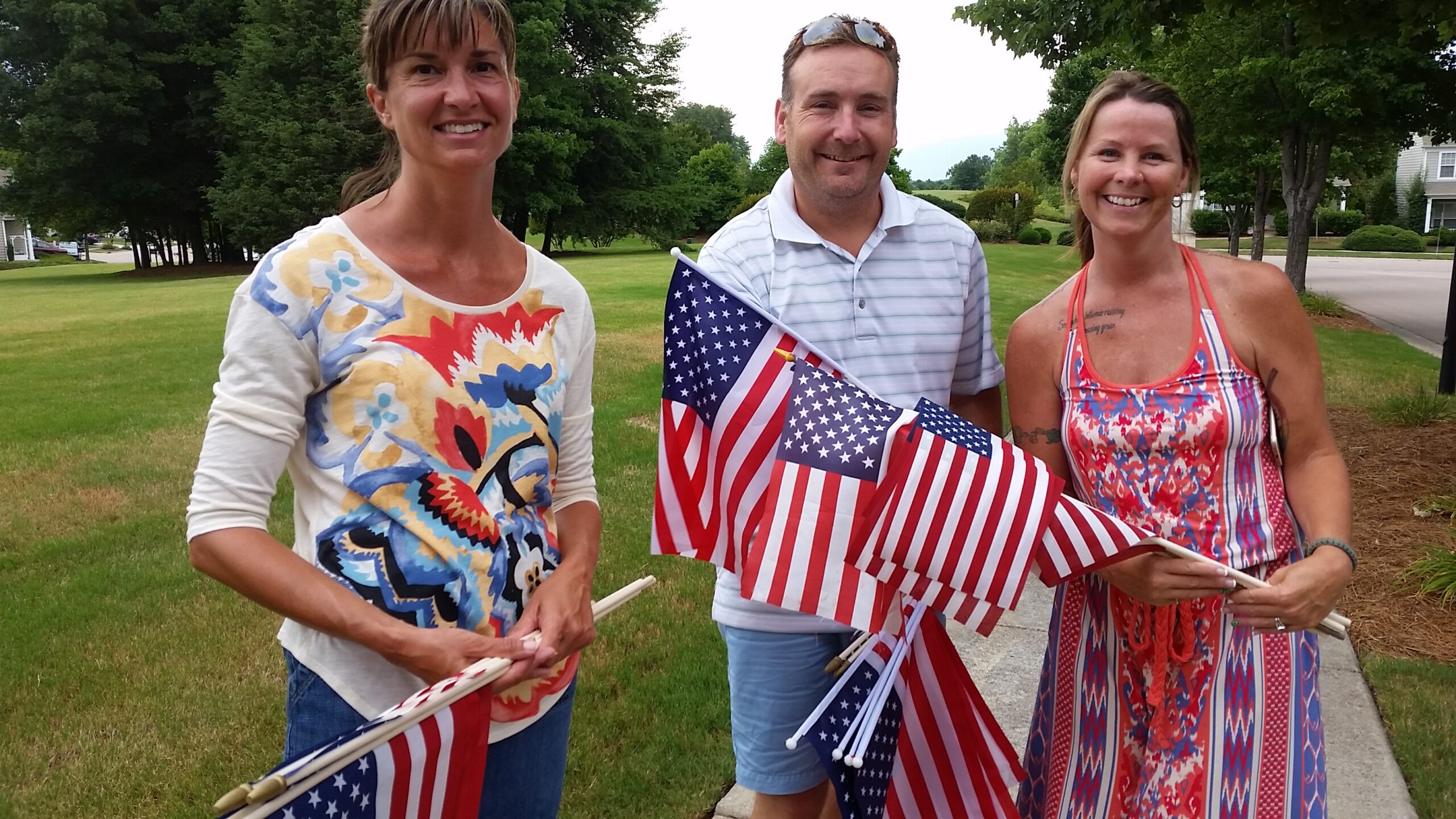 July 4. Plan a cookout, think about attending the concert this evening in Davidson, or dig the lawn chairs out for the fireworks tonight in The Peninsula, but make sure you celebrate our nation’s independence. Victoria Bay is all decked out: Pictured are Cindy Maple and Kevin and Kristin Foley. They helped line the entrance to the neighborhood with dozens of American flags.