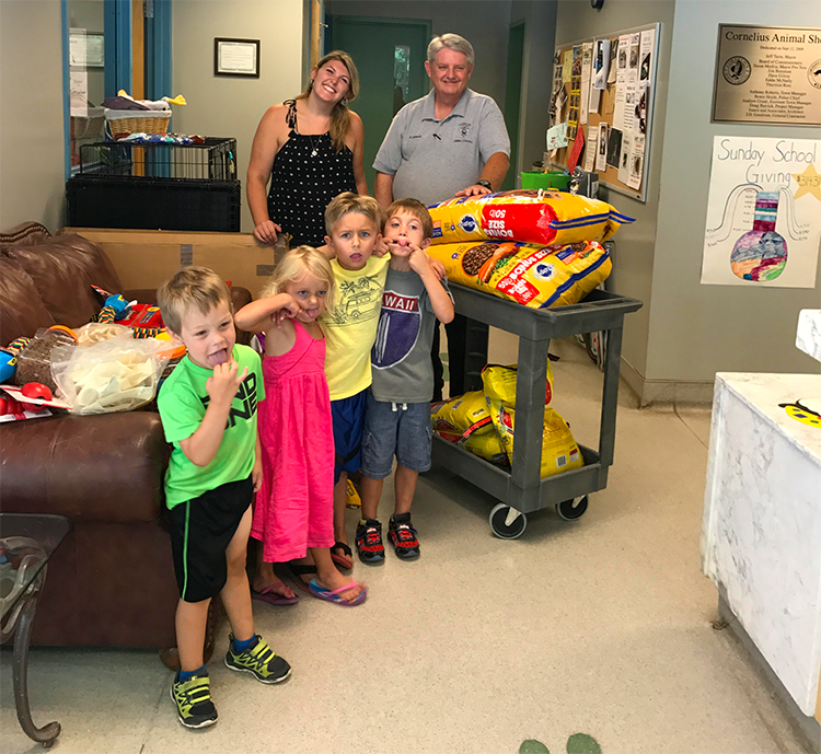 Aug. 18. It looks like the Cornelius Animal Shelter is known far and wide among young animal advocates. Four Lake Norman kids, ages 3-6, helped raise $150 for CAS by selling lemonade and muffins on Faith Road in Mooreseville. Target in Huntersville chipped in $150 as well and the kids embarked on a pet care shopping spree before. Nanny Allie Redder sent the information to Cornelius Today, saying, “I felt it was amazing they wanted to raise money for someone/something other than themselves…and followed through!” Allie has a direct connection to the animal shelter on Meridian Street: Her dog Moose is an alumni. From left to right, Mason, Grace, Charlie and Tyler.