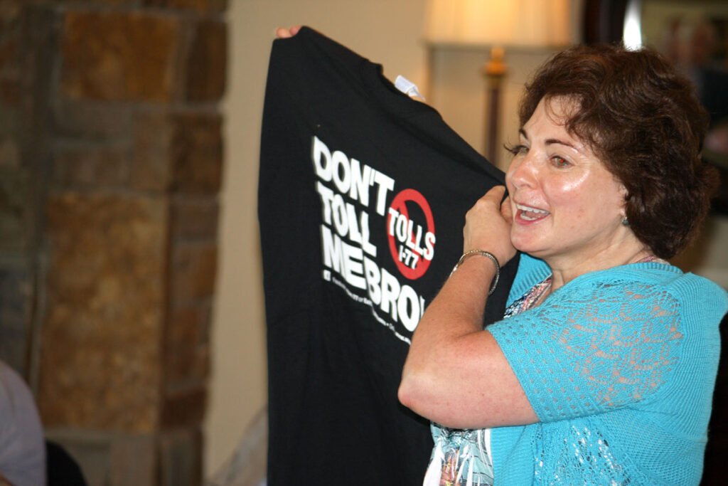 - Anti-toll activist Sharon Hudson displays an anti-toll t-shirt