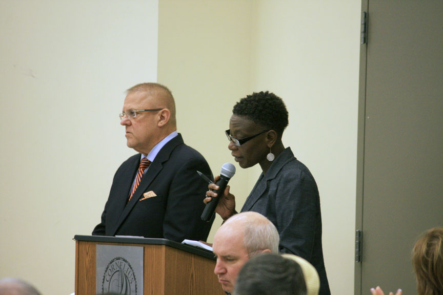 A question asking if it’s too late to stop I-77 toll lanes evoked the only spontaneous ovation of the day from the audience and an unusual confession from Commissioner Jim Duke. “Two years ago we met with Kurt Naas about his lawsuit and I only wish we had listened more carefully and done more to support his cause then.” Commissioner Gilroy, who has opposed the project from the start, commended Duke for his honesty, and Mayor Pro-Tem Washam said he believes it’s still not too late: “There’s still a lot going on behind the scenes.”