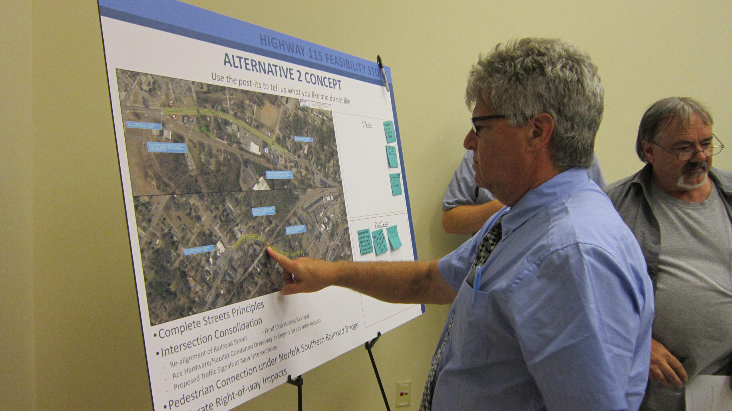 - Town Commissioner Dr. Michael Miltich examines the new route for Railroad Street outlined in Option Two.